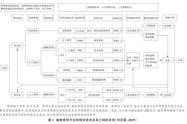 因此,植物育種歷史說明,育種工作者必須了解系統育種、誘變育種、雜交育種、倍性育種、雜交種育種、轉基因育種、基因編輯育種等七段育種歷史,并懂得育種技術、育種階段、育種產品等之間的關系和聯系。各個因子的關系總結如圖1。了解圖1中的育種主要技術、方法及之間的關系,對指導育種實踐有非常重大的作用。