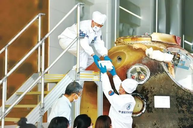 神舟十三號返回艙大底朝下、艙門朝上,身穿白色工作服的工作人員小心翼翼地爬上梯子,爬進艙內,將一個個用白布包好的方形包裹依次遞給艙外的工作人員。做好登記等交接工作后,這些包裹便“物歸原主”。