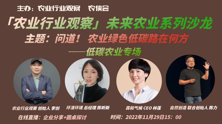 為此,農業行業觀察&農俠會特此舉辦了一場以“問道!農業綠色低碳路在何方”為主題的沙龍研討會,邀請了霖和氣候科技(北京)有限公司/CEO 林蓮、北京環清環境科技有限公司 /總經理陳昕新、自然創造(北京)科技有限公司 /聯合創始人陳力等嘉賓圍繞農業綠色低碳新趨勢解讀及分享,解密農業綠色低碳發展的新圖景、新商業、新模式、新應用,共同展望農業綠色低碳發展的可能性。
