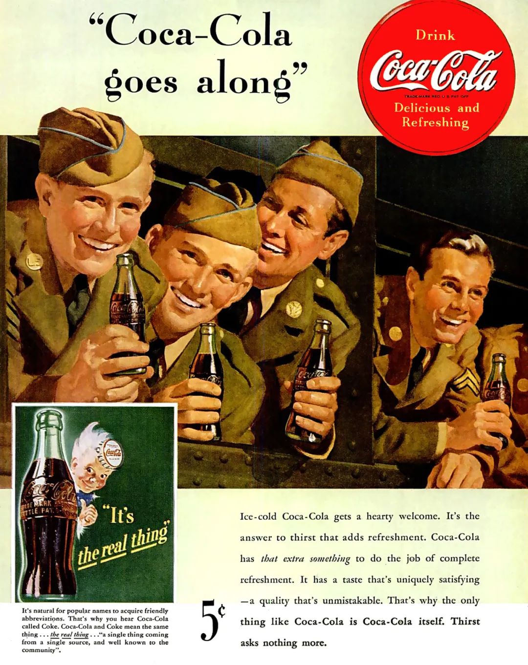 曾有美國士兵在家書中如此寫道:“二戰對可口可樂來說是個至關重要的轉折點,使得可口可樂公司在戰時成為一種‘全球公認的好飲料’。令可口可樂人崇敬的嘶嘶作響的飲料,也對美國戰士有一種近乎神圣的意義。”二戰期間可口可樂的宣傳海報如圖1-13所示。