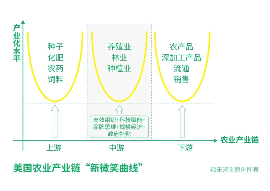 美國農業通過“高效組織+科技賦能+品牌思維+規模經濟+政府補貼”五種力量支撐,托舉起中間的“洼地”,實現了中游的品牌化溢價,也實現了整個產業鏈的“共同富裕”,形成了新的“微笑曲線”(見圖 1-15)。其背后的核心密碼是組織方式。