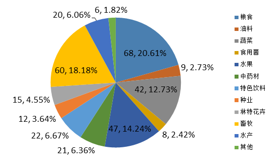 主導產業排序分別為糧食類68個、畜牧60個、水果47個、蔬菜42個、特色飲料22個、中藥材21個、水產20個、林特花卉15個、種業12個、食用菌8個、油料9個、重要農產品(橡膠、糖料、纖維類)6個。詳見表2。