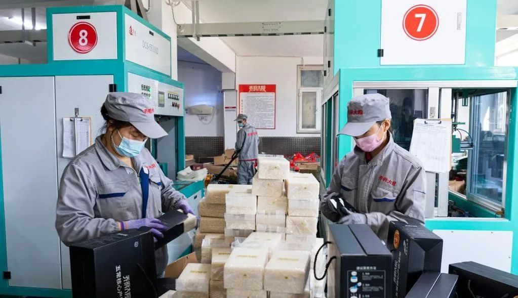 ▲ 2022年11月2日,在黑龍江省五常市一大米加工企業,工作人員在包裝大米。新華社記者 謝劍飛 攝