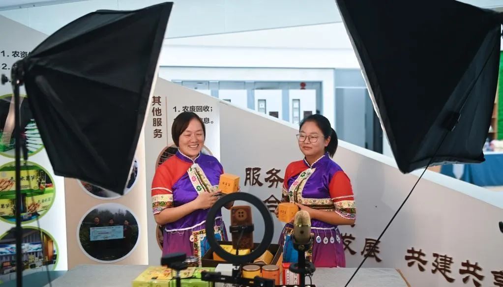▲ 2022年10月25日,杭州市臨安區太湖源鎮眾社村的畬族青年呂欣(左)、龔海燕在電商直播中心進行線上直播,銷售當地土特產。新華社記者 徐昱 攝