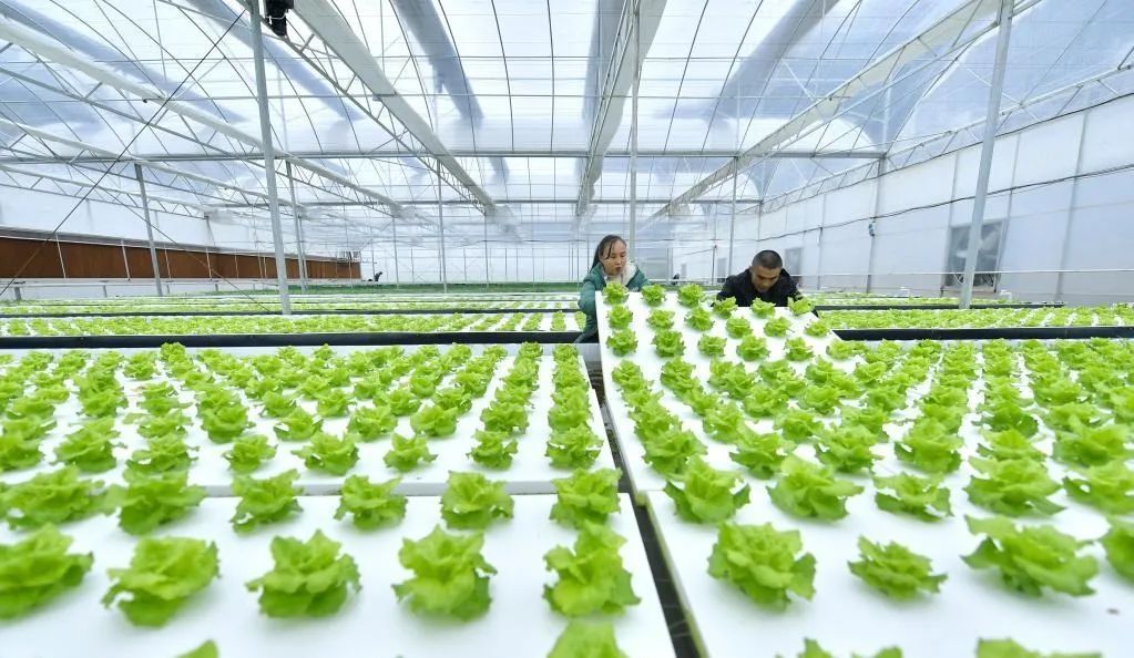 ▲ 2022年11月29日,湖北省宣恩縣椒園鎮鑼圈巖村的農民在溫控大棚里檢查水培蔬菜的生長情況。新華社發(宋文攝)