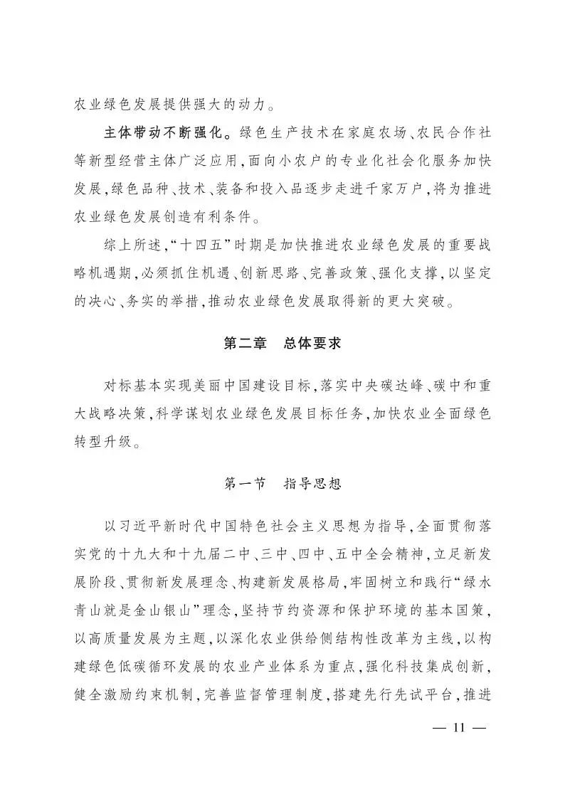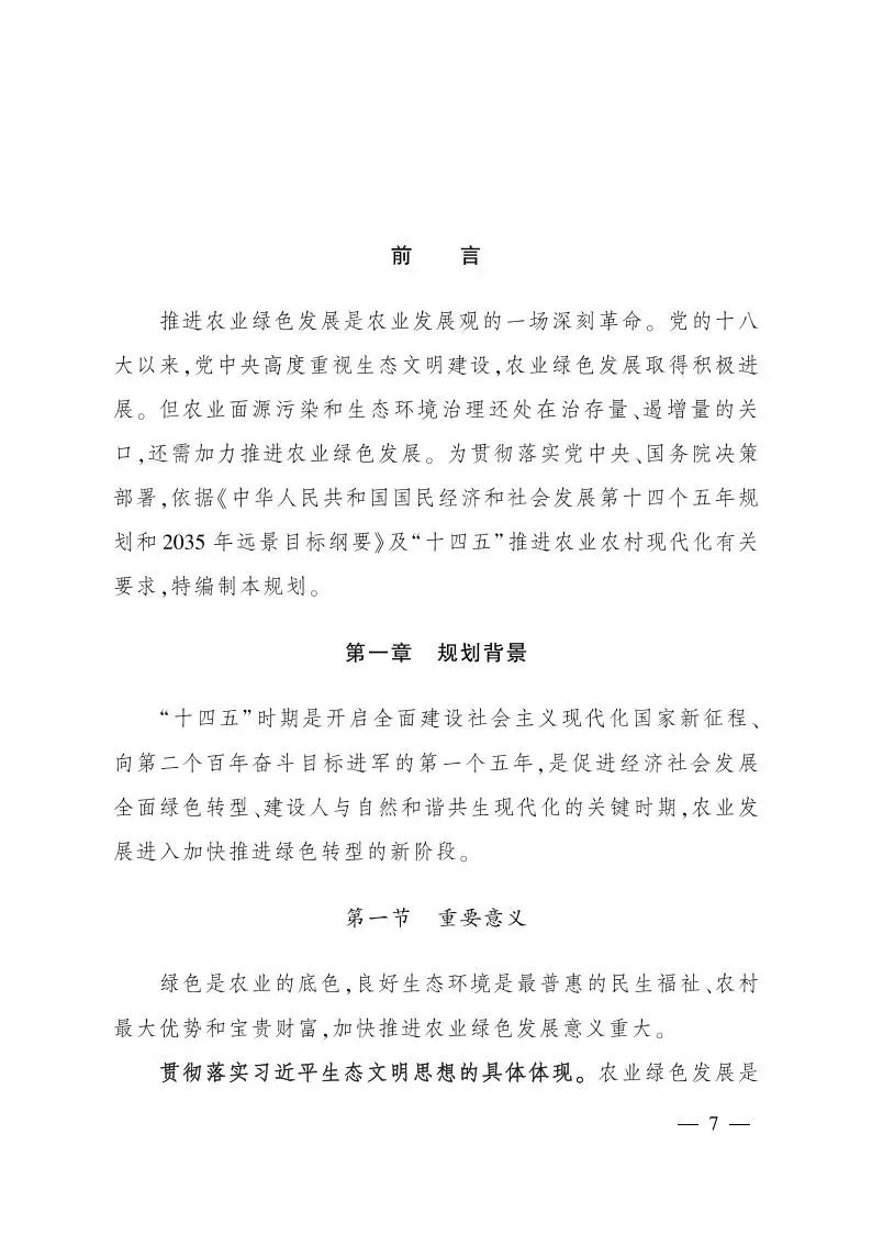 為貫徹落實黨中央、國務院推進農業綠色發展決策部署,加快農業全面綠色轉型,持續改善農村生態環境,農業農村部、國家發展改革委、科技部、自然資源部、生態環境部、國家林草局制定了《“十四五”全國農業綠色發展規劃》(以下簡稱《規劃》),現印發你們,請結合實際認真貫徹執行。
