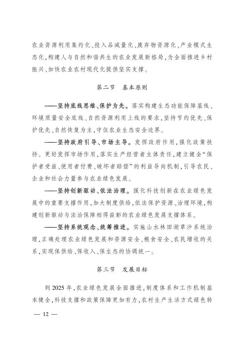 規劃提出,到2025年,耕地、水等農業資源得到有效保護、利用效率顯著提高,退化耕地治理取得明顯進展,以資源環境承載力為基準的農業生產制度初步建立。化肥、農藥使用量持續減少,農業廢棄物資源化利用水平明顯提高,農業面源污染得到有效遏制。耕地生態得到恢復,生物多樣性得到有效保護,農田生態系統更加穩定,森林、草原、濕地等生態功能不斷增強。主要農產品溫室氣體排放強度大幅降低,農業減排固碳和應對氣候變化能力不斷增強,農業用能效率有效提升。