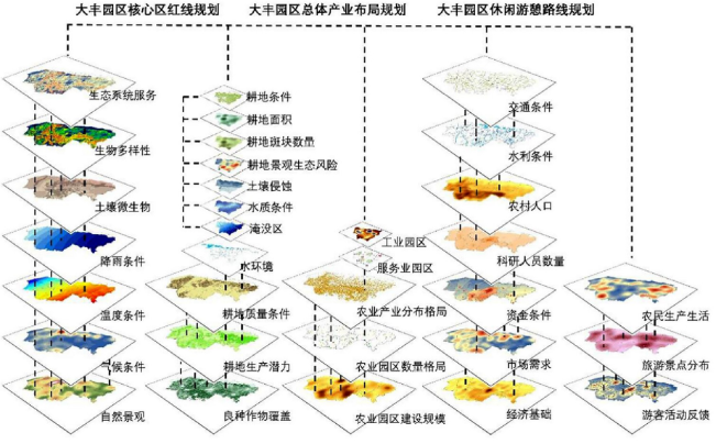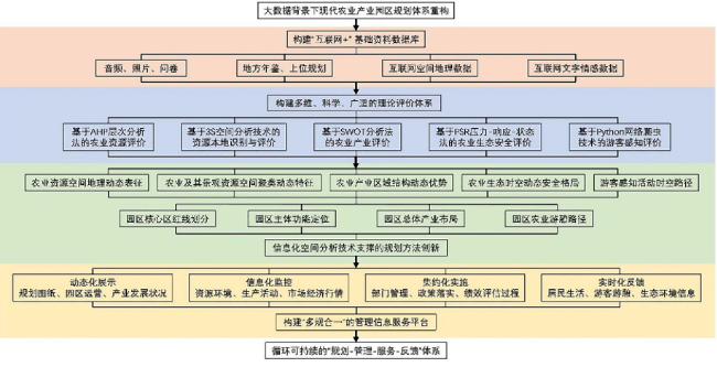傳統農業產業園區規劃主要依據簡單的現狀調研分析和規劃人員的主觀判斷,編制強制性的規劃內容和階段性的實施成果,逐漸脫離實際,科學性常受質疑。尤其當規劃進行到土地資源評價、農業產業評估、基礎設施以及生態游憩規劃等步驟時,缺乏對園區及其周邊地區人口結構組成、經濟發展活力、生態循環整體性、交通系統等實時動態數據的挖掘和分析,忽略了對園區運行效率、經濟活力、生態發展動向和游客滿意度等反應農業產業園區發展質量的評價,從而導致園區規劃缺乏系統的信息管理體系、客觀的規劃方案和科學的評價。