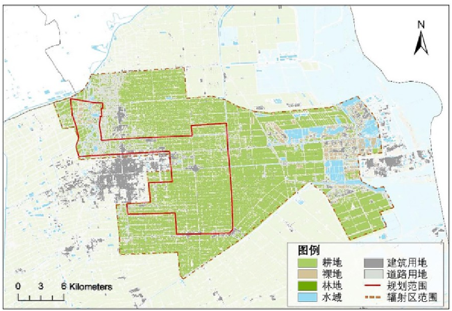 大豐農業產業園區成立于2008年,位于江蘇省鹽城市大豐區東北部。交通便捷,區位優勢明顯(圖2)。總體規劃面積為82km2(圖3),其中耕地面積72.16km2。園區農業資源豐富,農旅融合特色鮮明,是“大豐國家現代農業綜合標準化示范區”的核心板塊,曾被認定為省級現代農業產業(示范)園,并在蘇北率先創成全國休閑農業與鄉村旅游示范縣、全國農業信息進村入戶試點縣。