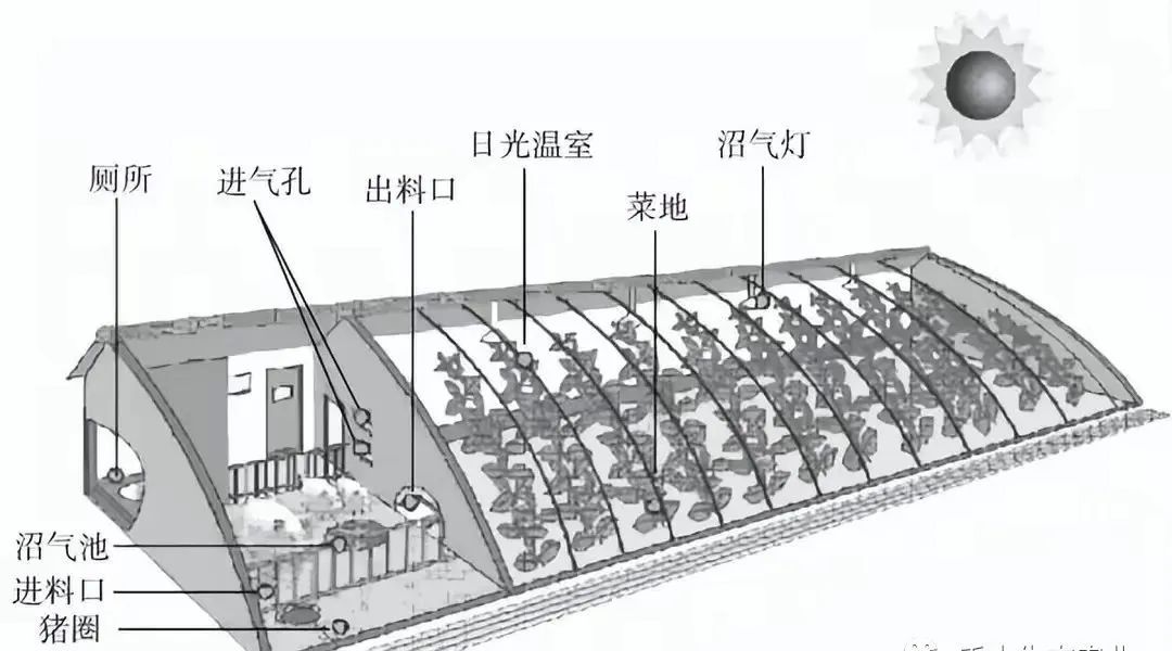 “四位一體”生態(tài)模式是在自然調(diào)控與人工調(diào)控相結(jié)合條件下,利用可再生能源(沼氣、太陽(yáng)能)、保護(hù)地栽培(大棚蔬菜)、日光溫室養(yǎng)豬及廁所等4個(gè)因子,通過(guò)合理配置形成以太陽(yáng)能、沼氣為能源,以沼渣、沼液為肥源,實(shí)現(xiàn)種植業(yè)(蔬菜)、養(yǎng)殖業(yè)(豬、雞)相結(jié)合的能流、物流良性循環(huán)系統(tǒng),這是一種資源高效利用,綜合效益明顯的生態(tài)農(nóng)業(yè)模式。運(yùn)用本模式冬季北方地區(qū)室內(nèi)外溫差可達(dá)30℃以上,溫室內(nèi)的喜溫果蔬正常生長(zhǎng)、畜禽飼養(yǎng)、沼氣發(fā)酵安全可靠。