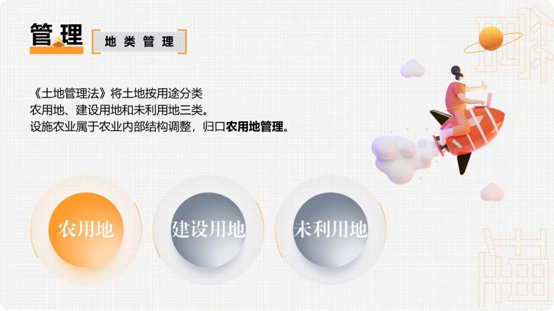 《土地管理法》將土地按用途分類農用地、建設用地和未利用地三類。設施農業屬于農業內部結構調整,歸口農用地管理。