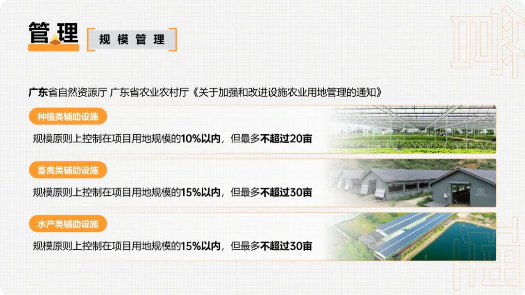 廣東:作物種植輔助設施用地規模原則上控制在項目用地規模的10%以內,最多不超過20畝;規模化糧食作物種植面積在500畝以上的,最多不超過30畝。畜禽水產養殖輔助設施用地規模原則上控制在項目用地規模的15%以內,最多不超過30畝。——廣東省自然資源廳 廣東省農業農村廳《關于加強和改進設施農業用地管理的通知》