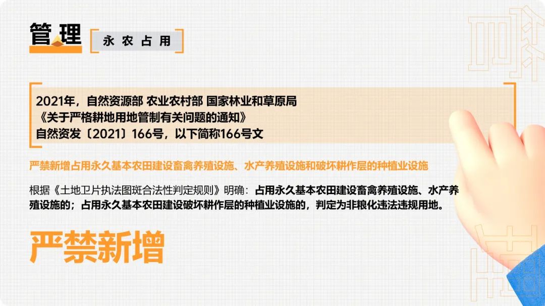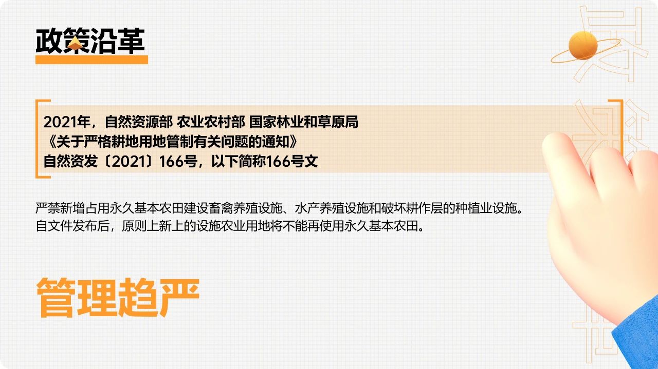 2021年,自然資源部 農業農村部 國家林業和草原局《關于嚴格耕地用地管制有關問題的通知》(自然資發〔2021〕166號,以下簡稱166號文)明確:嚴禁新增占用永久基本農田建設畜禽養殖設施、水產養殖設施和破壞耕作層的種植業設施。自文件發布后,原則上新上的設施農業用地將不能再使用永久基本農田。