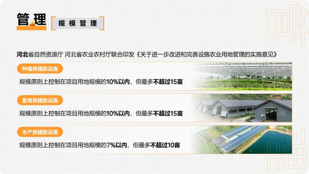 天津:輔助設施用地規模原則上控制在項目用地面積的10%以內,但最多不超過15畝。50畝(含)以上的規模化糧食生產配建的輔助設施用地規模,控制在種植面積的0.5%以內,但最多不超過15畝。畜禽養殖輔助設施用地規模原則上控制在項目用地面積的10%以內,但最多不超過15畝。水產養殖輔助設施用地規模原則上控制在項目用地面積的7%以內,但最多不超過10畝。——天津市規劃資源局 天津市農業農村委《關于進一步規范設施農業用地管理的通知》
