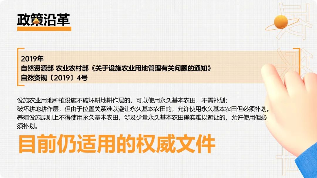 2019年,自然資源部 農業農村部《關于設施農業用地管理有關問題的通知》(自然資規〔2019〕4號,以下簡稱4號文)明確指出,設施農業用地種植設施不破壞耕地耕作層的,可以使用永久基本農田,不需補劃;破壞耕地耕作層,但由于位置關系難以避讓永久基本農田的,允許使用永久基本農田但必須補劃。