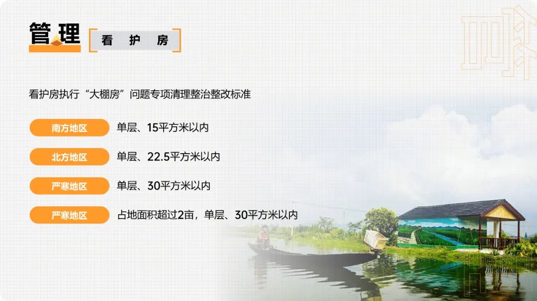 要求各類設施農業用地規模由各省(區、市)自然資源主管部門會同農業農村主管部門根據生產規模和建設標準合理確定,其中,看護房執行“大棚房”問題專項清理整治整改標準,養殖設施允許建設多層建筑。