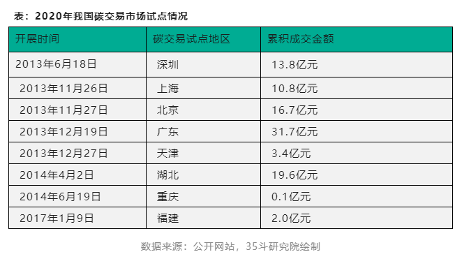 在實現碳達峰、碳中和的過程中,碳排放交易是不可忽視并值得重視的關鍵路徑。我國于2013年6月18日從深圳市開始試點碳交易市場,陸續又在上海、北京、廣東、天津、湖北、重慶、福建試點了八個碳交易市場。截至2020年,我國碳交易成交總額為98.1億元,其中廣東的成交額最高,達到31.7億元。