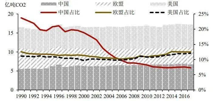 圖:中美歐農業部門碳排放絕對值及其占本國總排放量的比重