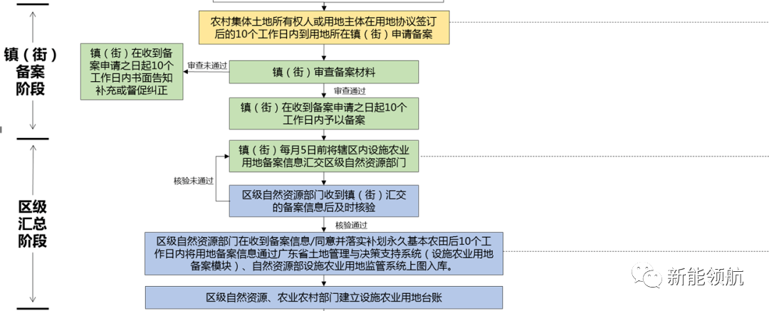 關于設施農業用地的備案流程,一般由設施農業用地主體向所在鎮街一級主管部門提出申請,設施農業用地主體、集體土地所有權人需就設施農業用地的相關使用條件協商一致,簽署相關格式化文本《設施建設方案》《廣東省設施農業用地協議》《土地使用條件》《土地復墾承諾計劃書》《土地復墾費用使用監管協議》,并將上述文本一并報鎮街一級主管部門備案。鎮街一級主管部門收到相關材料后,在規定時間內審查備案,并將相關信息報區級自然資源主管部門核驗。區級自然資源主管部門核驗完成后,將設施農業用地備案信息報廣東省土地管理與決策支持系統(設施農業用地備案模塊)、自然資源部設施農業用地監管系統上圖入庫。