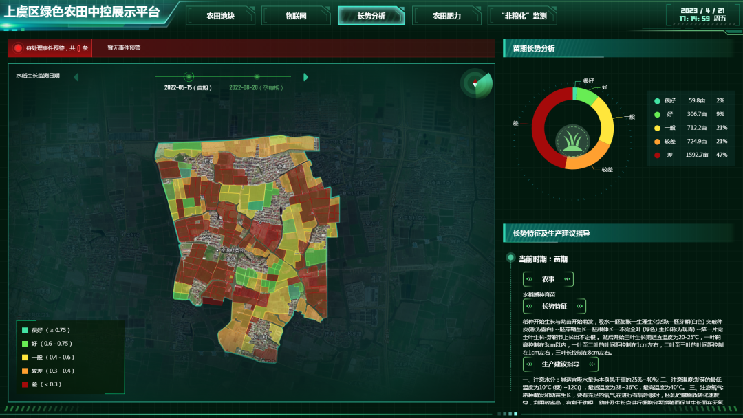 基于崧廈街道農(nóng)業(yè)地理基礎(chǔ)數(shù)據(jù),整合高標(biāo)準(zhǔn)農(nóng)田等各類空間關(guān)聯(lián)數(shù)據(jù),匯聚成“一張圖”,全面感知高標(biāo)準(zhǔn)農(nóng)田的地塊、物聯(lián)網(wǎng)監(jiān)測、作物長勢、農(nóng)田肥力、作物種植利用等信息,及時、準(zhǔn)確地呈現(xiàn)和傳遞最新農(nóng)田環(huán)境和生長狀況。通過多維度數(shù)據(jù)分析,為農(nóng)田生產(chǎn)管理及預(yù)警決策提供數(shù)據(jù)支撐,實現(xiàn)實時、精準(zhǔn)、高效管理,大大減少人力、物力的投入,提高管理工作水平。
