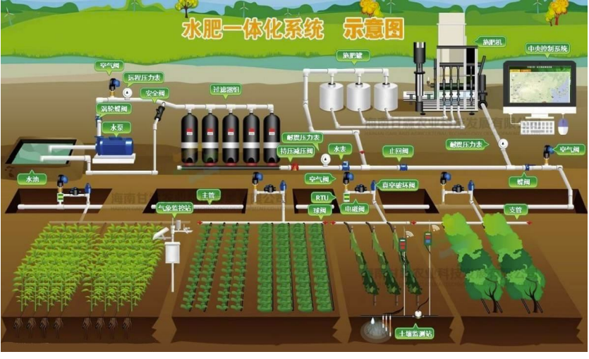 ?肥?體化智能灌溉系統可以幫助?產者很?便的實現?動的?肥?體化管理。系統由上位機軟件系統、區域控制柜、 分路控制器、變送器、數據采集終端組成。通過與供?系統有機結合,實現智能化控制。整個系統可協調?作實施 輪灌,充分提?灌溉??效率,實現節?、節電,減少勞動強度,降低??投?成本。