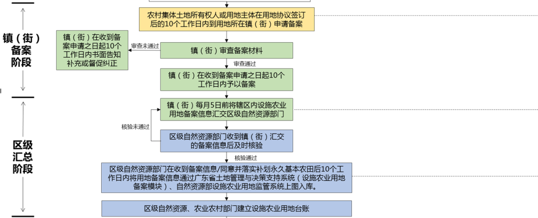 關于設施農業用地的備案流程,一般由設施農業用地主體向所在鎮街一級主管部門提出申請,設施農業用地主體、集體土地所有權人需就設施農業用地的相關使用條件協商一致,簽署相關格式化文本《設施建設方案》《廣東省設施農業用地協議》《土地使用條件》《土地復墾承諾計劃書》《土地復墾費用使用監管協議》,并將前述文本一并報鎮街一級主管部門備案。鎮街一級主管部門收到相關材料后,在規定時間內審查備案,并將相關信息報區級自然資源主管部門核驗。區級自然資源主管部門核驗完成后,將設施農業用地備案信息報廣東省土地管理與決策支持系統(設施農業用地備案模塊)、自然資源部設施農業用地監管系統上圖入庫,具體如下: