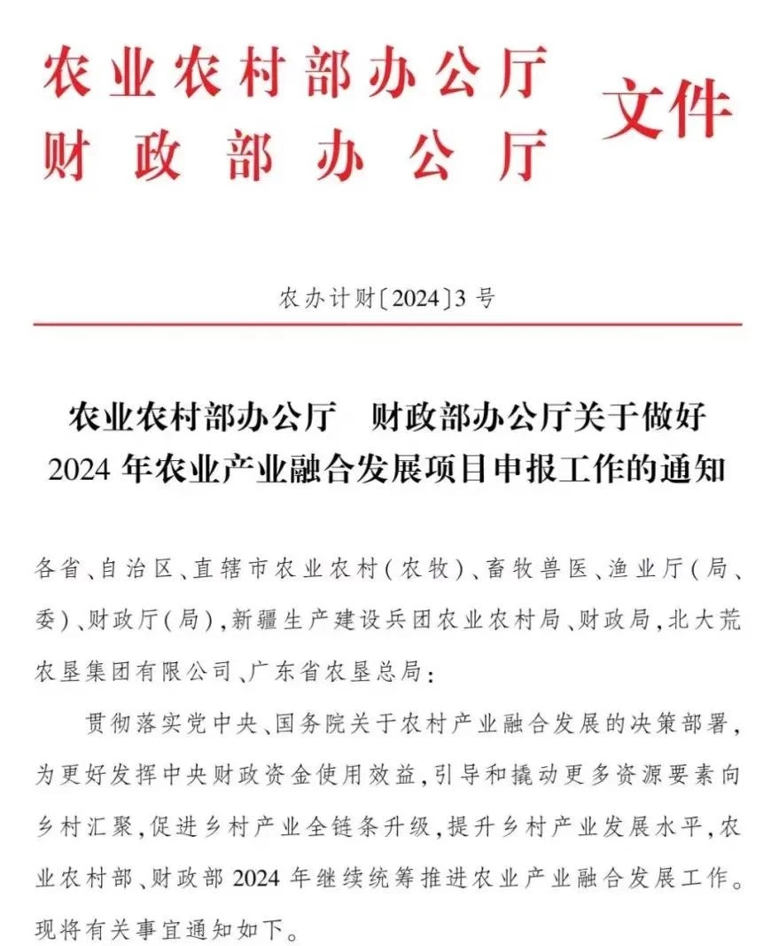 導語:根據農業農村部印發《全國鄉村產業發展規劃(2020-2025年)》,按照中央一號文件的要求,2024年中央財政對以前年度符合條件的項目給予延續支持。為更好的發揮中央財政資金使用效益,引導和撬動更多資源要素向鄉村匯聚,促進農業產業轉型升級,整體提升農業產業鏈現代化水平,近日,農業農村部、財政部印發了《2024年農業產業融合發展項目申報工作的通知》(以下簡稱《通知》)。根據《通知》和往年的申報經驗,現將申報項目具體條件和流程整理如下: