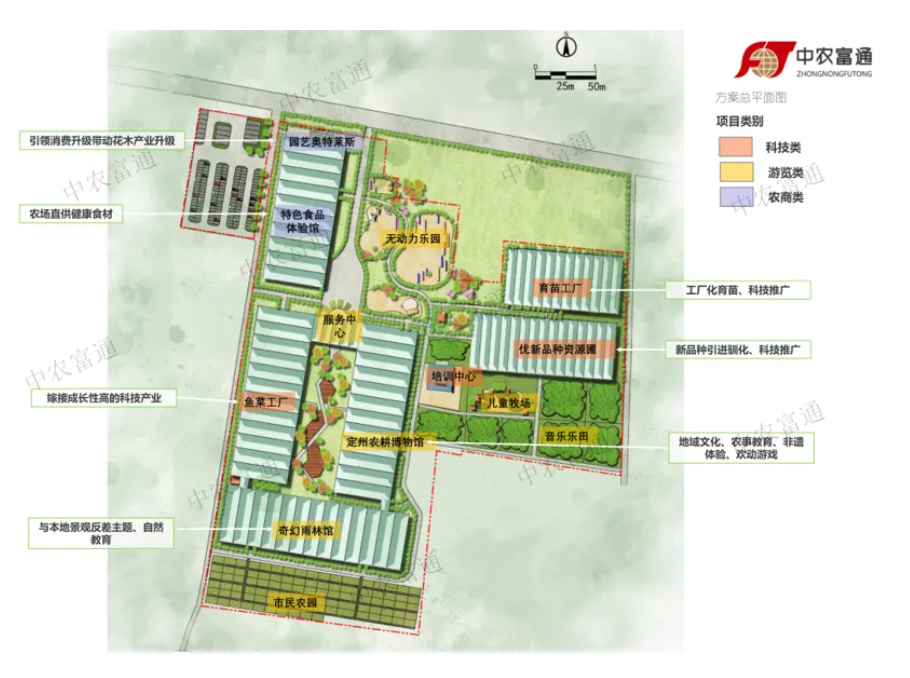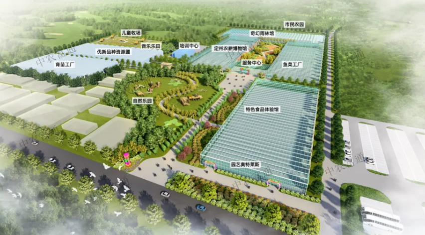 項目結合定州農業特色,結合獨有歷史文化背景和晏陽初平民教育的經歷,通過特色主題場館串聯起整個項目。場館主要包含魚菜工廠科技館、農耕文化主題場館、熱帶風情主題場館、工廠化育苗中心、科技創新中心和特色食品體驗館。室外主要包括音樂田園、萌寵樂園和無動力樂園等項目。以都市農業體驗、主題節慶為主要特色活動,結合中小學生社會實踐課堂和研學教育、農民職業培訓教育等課程,發揮社會化服務技術優勢服務周邊農業項目,實現服務都市、繁榮農村、提升農業、富裕農民的目標。