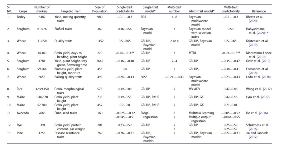 表2 利用多性狀模型與單性狀模型進(jìn)行基因組選擇研究的總結(jié)