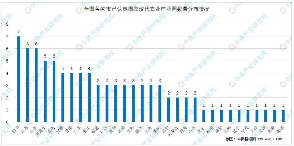 在87個國家現代農業產業園中,全國31省市皆有產業園入選。其中四川省經認定的國家現代農業產業園數量最多,目前共有7個;江蘇省和山東省分別有6個現代農業產業園被認定為國家現代農業產業園;黑龍江及湖南省各有4個。其余各省市國家現代農業產業園分布如下: