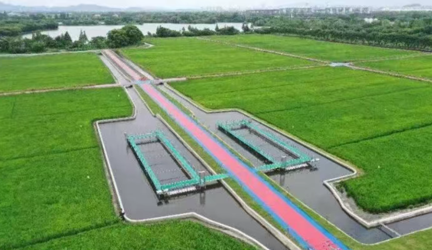 “稻漁共生+跑道養魚”新型生態種養模式在稻魚共生的基礎上,增加了跑道養殖。這種模式養殖魚類始終在溶氧高的流水中生長,養殖的魚生長速度快,成活率高,再通過污水處理系統帶走餌料殘渣和魚糞便等殘渣雜物,從而達到調節凈化水質、改善池塘水體環境,提高餌料利用率,促進魚類生長發育的效果。