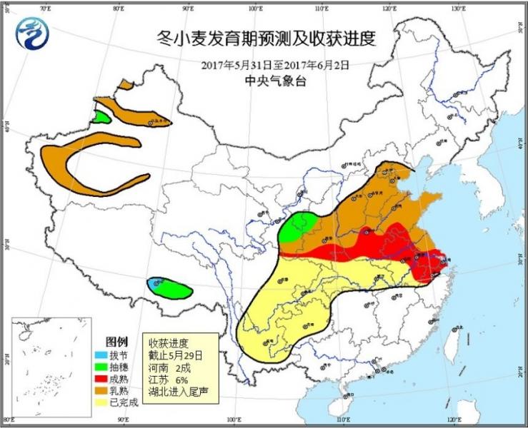截止5月29日,貴州夏收完成,湖北小麥?zhǔn)斋@處于掃尾階段,安徽北部小麥進(jìn)入大面積收獲階段;江蘇小麥?zhǔn)斋@約6%,南部已收20%;河南小麥?zhǔn)斋@已過2成;山東南部冬小麥開始零星收獲。