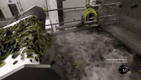 清洗的第一個(gè)步驟是用滾筒把蔬菜壓進(jìn)水里,做“浸入清洗”兩次。