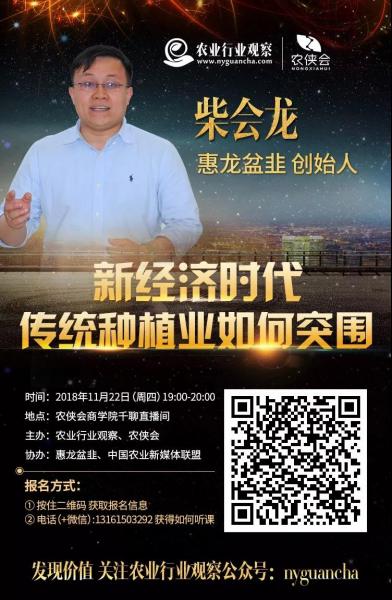 本周四晚上19:00,農業行業觀察、農俠會邀請了惠龍韭園創始人柴會龍做客分享如何“如何靠韭菜盆栽:1年營收10000萬”的經營故事。