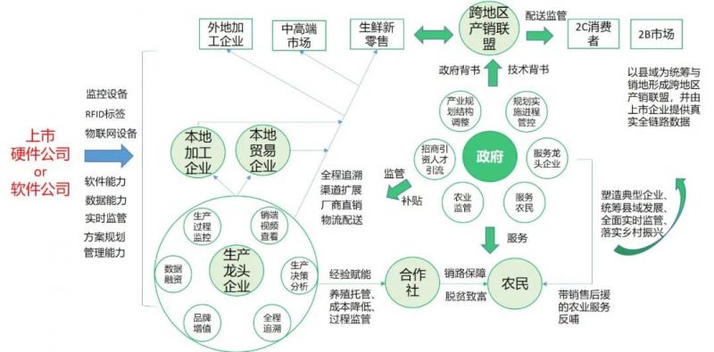 第三,政府針對當地的六項業務中也可以發揮上市企業價值:產業規劃結構調整可以發揮企業的產業規劃能力,并引入合適的合作伙伴;以軟硬件支撐產業規劃結構過程發展,進行規劃實施進程管控;服務龍頭企業,是以資金+技術+管理形式,全面為當地龍頭企業輸入補貼、金融保險、信息技術、物聯網硬件技術、管理技術,打造高科技技術和管理理念武裝的新型養殖龍頭,提高其產品附加值,拔升管理水平,降低經營成本,提高供應鏈效率;服務農民,是政府的基本職責,但為農民的服務必須是帶銷售后援性質的農業服務反哺,在提供一系列信息化服務的同時,必須切實幫農民解決銷路問題,可依托合作社和龍頭企業解決,無法直接與銷售側的產銷聯盟發生聯系;農業監管,是農委和農業局的主要關心之處,需要依托構建產銷聯盟、服務龍頭企業和服務農民過程中獲取數據資源,以便成為農業監管的可視化展示基礎,并將縣域農業資源一張圖展示,充分涵蓋農業資源、養殖過程、貿易流向、產業數據等細分領域的大屏展示,既有宣傳意義,悠悠成果展示鼓勵價值;招商引資人才引流,是縣域農業產業可持續性發展的保障,可利用上市企業背景進行融資合辦,養殖、加工、貿易、電商、服務等商務資源的導入,并引入相應的人才,同時進行有效的內部挖掘,如使龍頭企業的員工更多接觸外界商業模式,逐漸成長。