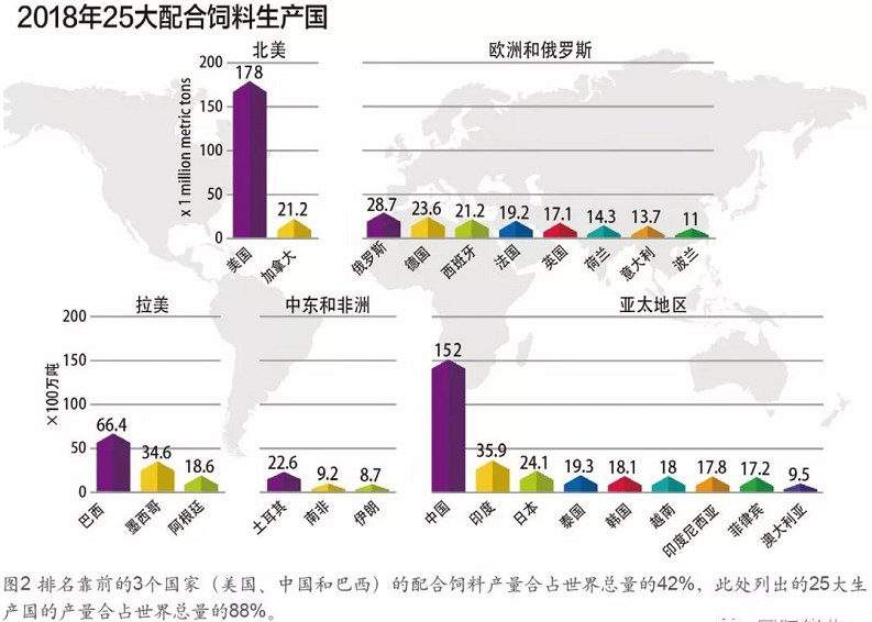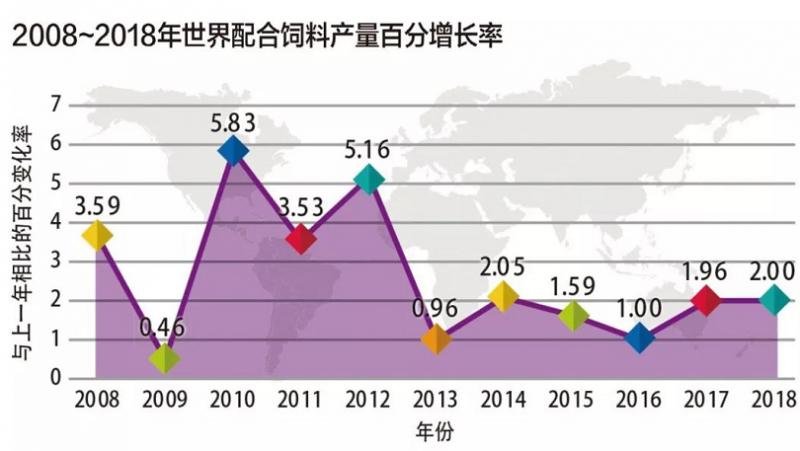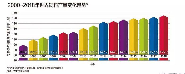 2018年,世界配合飼料產量延續2017年的增長勢頭,上漲2%。盡管在世界某些地區暴發了疫情,導致當地的豬禽養殖數量下降,但是,全球動物飼料的總產量繼續上漲,只不過增長速率不如本世紀初。