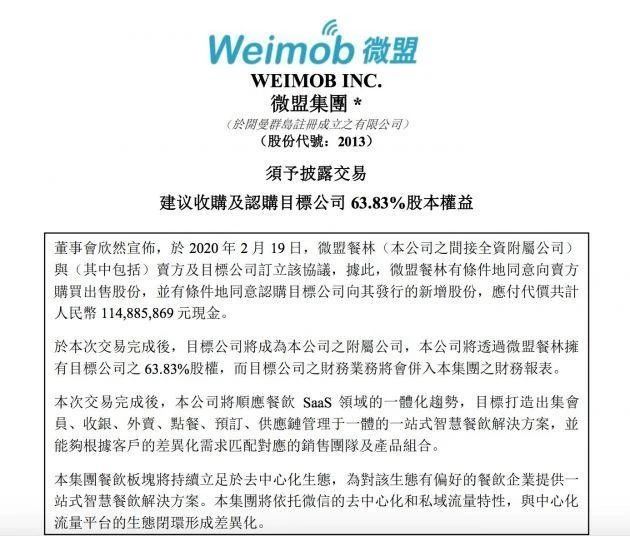 2月20日消息,昨日晚間,微盟集團發布公告稱,全資附屬公司“微盟餐林”與無錫雅座訂立協議,有計劃向賣方購買出售股份,并有條件地同意認購目標公司向其發行的新股份,總代價為114,885,869元現金,其中購買出售股份的代價為人民幣34,885,869 元,認購新增股份的代價為人民幣 80,000,000 元。