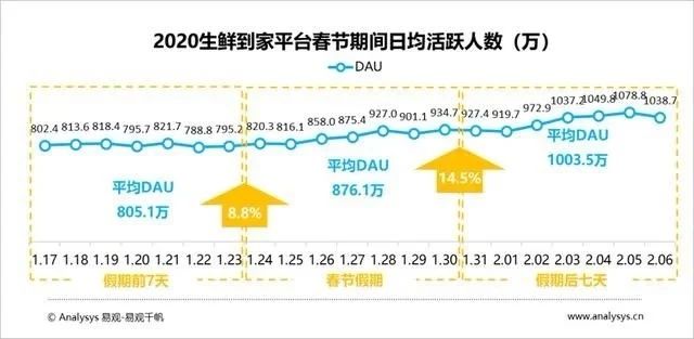 據(jù)易觀千帆數(shù)據(jù)顯示,2020年春節(jié)期間(1.24-1.30)生鮮到家零售平臺(tái)的平均日活人數(shù)達(dá)到879.1萬人,相較假期前7天平均日活人數(shù)提升了8.8%,后續(xù)伴隨生鮮電商企業(yè)啟動(dòng)緊急預(yù)案和社會(huì)化用工的投入,2月2號(hào)后又出現(xiàn)大幅度提升,數(shù)據(jù)顯示假期后七天相較于春節(jié)期間提升了14.5%,預(yù)計(jì)在疫情未完全消除前,生鮮電商DAU還會(huì)保持增長(zhǎng)態(tài)勢(shì),而增幅與企業(yè)供應(yīng)鏈運(yùn)營和履約能力息息相關(guān)。