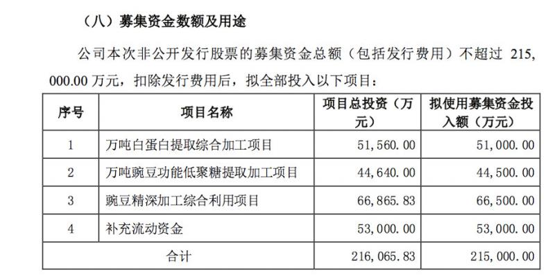 雙塔食品發(fā)布定增預(yù)案,本次非公開發(fā)行股票募集資金總額不超過21.5億元,扣除發(fā)行費(fèi)用后全部用于萬噸白蛋白提取綜合加工項(xiàng)目、萬噸豌豆功能低聚糖提取加工項(xiàng)目、豌豆精深加工綜合利用項(xiàng)目、補(bǔ)充流動(dòng)資金。