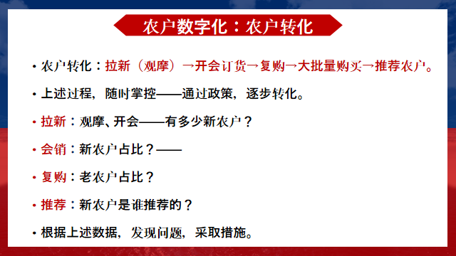 從拉新(觀摩)→開會訂貨→復購→大批量購買→推薦農戶,這是一個農戶轉化的過程,也是一個農戶終身價值體現的過程。