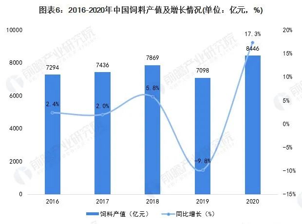 從飼料產值來看,我國飼料總產值不斷攀升,2016年,我國飼料產值為7294億元,到2020年,我國飼料產值上升至8446億元。