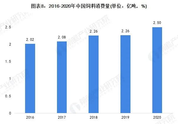 目前,國內飼料主要用于養殖業,包括生豬、家禽、反芻動物、水產等多個方面,是我國養殖業發展的重要支柱。2016-2020年,我國飼料消費量在2億噸以上,并且呈上升趨勢。
