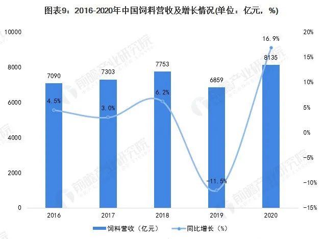 從飼料行業的營收情況來看,2016年,我國飼料營收為7090億元,同比增長4.5%;2020年,我國飼料營收達到8135億元,同比增長16.9%。