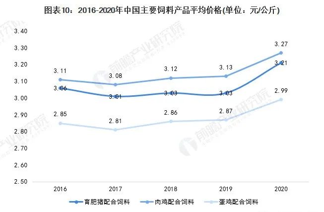 根據全國畜牧總站監測預警信息顯示,2016-2020年,全國主要的三大飼料產品均價呈上升趨勢。2020年,中國育肥豬配合飼料均價上漲至3.21元/公斤;肉雞配合飼料均價上漲至3.27元/公斤;蛋雞配合飼料均價上漲至2.99元/公斤。
