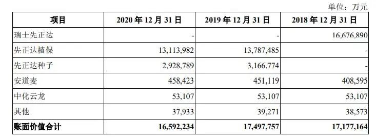 從構成看,因收購瑞士先正達、Adama Solutions、中化云龍和其他公司確認的商譽分別為1604.28億元、45.84億元、5.31億元和3.79 億元。先正達成立后,悉數承接了上述因收購產生的商譽,并將瑞士先正達的千億元商譽拆分為先正達植保、先正達種子兩個分部。