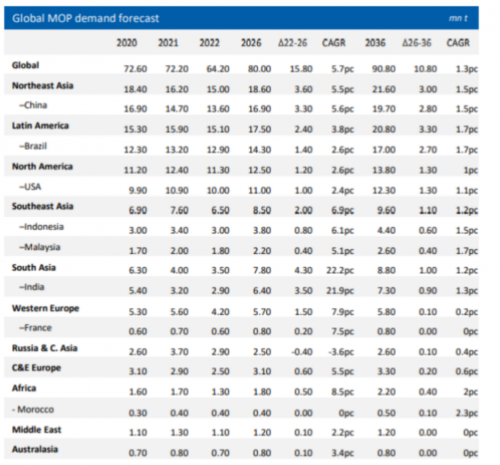 雖然我國人口增長出現(xiàn)了新低,但全球人口增長還是很快的,從1975年40億人口增長到80億人口只用了46年,以前從10億人口增長到20億人口用了100年時間,現(xiàn)在從70億人口增長到80億人口只用了12年時間。印度、埃塞俄比亞、剛果金、巴林、阿富汗等一些亞洲、非洲國家是人口增長較快的國家。隨著人口的快速增長,對糧食的需求越來越大,糧食種植面積也會不斷增加,對氮磷鉀的需求也在逐步增大。特別在各國高度關(guān)注糧食安全問題的當(dāng)下,更加凸顯出鉀肥對于農(nóng)業(yè)生產(chǎn)的不可或缺性。由于鉀肥具有獨特的抗逆性作用(抗倒伏、抗病蟲害、抗凍性)、優(yōu)異的增產(chǎn)增收和增強(qiáng)果蔬、糧食口感的效果,考慮到對抗全球極端天氣以及緩解糧食供給危機(jī)因素,預(yù)計2022年全球氯化鉀需求為6420萬噸,到2026年全球需求將上升為8000萬噸,年復(fù)合增長率為5.7%,其中,中國需求量約為1700萬噸,年復(fù)合增長率5.6%,東南亞需求為850萬噸,年復(fù)合增長率為6.9%。折算下來,即使在樂觀情形下,2026年鉀肥仍有1250萬噸的供需缺口。因此,從上述這些數(shù)據(jù)表明,全球鉀肥供給增速不及需求增速,國際鉀肥供需緊張仍將持續(xù)相當(dāng)長時間,所以鉀肥價格還將維持在高位運(yùn)行。