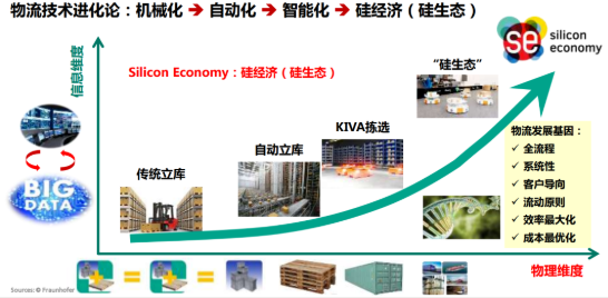 依據這些物流發展基因,德國弗勞恩霍夫物流研究院分析了物流的技術發展路徑,并認為物流技術的進化歷程是從機械化、自動化、智能化再到硅經濟(硅生態)。