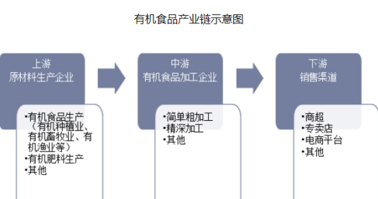 有機食品的產業鏈上游環節主題為有機食品原材料生產企業,主要負責有機食品生產和有機肥料等投入品的生產;中游環節主體為有機食品加工企業,主要負責加工、儲存和運輸;下游涉及銷售渠道,主要有商場、有機食品專賣店和電商平臺等,最終流向消費者。