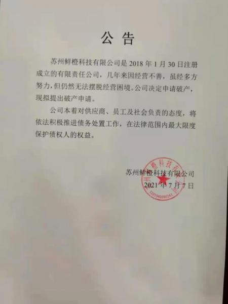 農(nóng)業(yè)行業(yè)觀察|剛剛,社區(qū)團購品牌同程生活運營主體蘇州鮮橙科技有限公司,在其官方微信公號發(fā)布公告,因經(jīng)營不善,多方努力后仍然無法擺脫經(jīng)營困境,公司決定申請破產(chǎn),現(xiàn)擬申請破產(chǎn)。