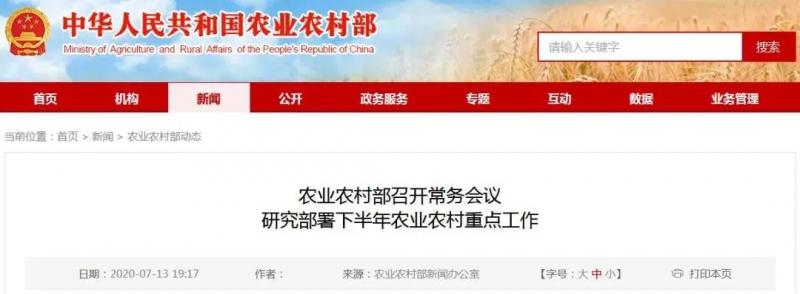 7月13日,農業農村部部長韓長賦主持召開部常務會議,研究部署下半年農業農村重點工作。會議強調,要深刻認識做好今年“三農”工作的極端重要性,對標對表習近平總書記重要指示批示和中央決策部署,圍繞全面小康和脫貧攻堅,采取務實有效舉措和超常規措施,扎實做好下半年重點工作,確保糧食產量保持在1.3萬億斤以上、生豬產能基本恢復到接近常年水平,努力實現全年“三農”工作目標任務。